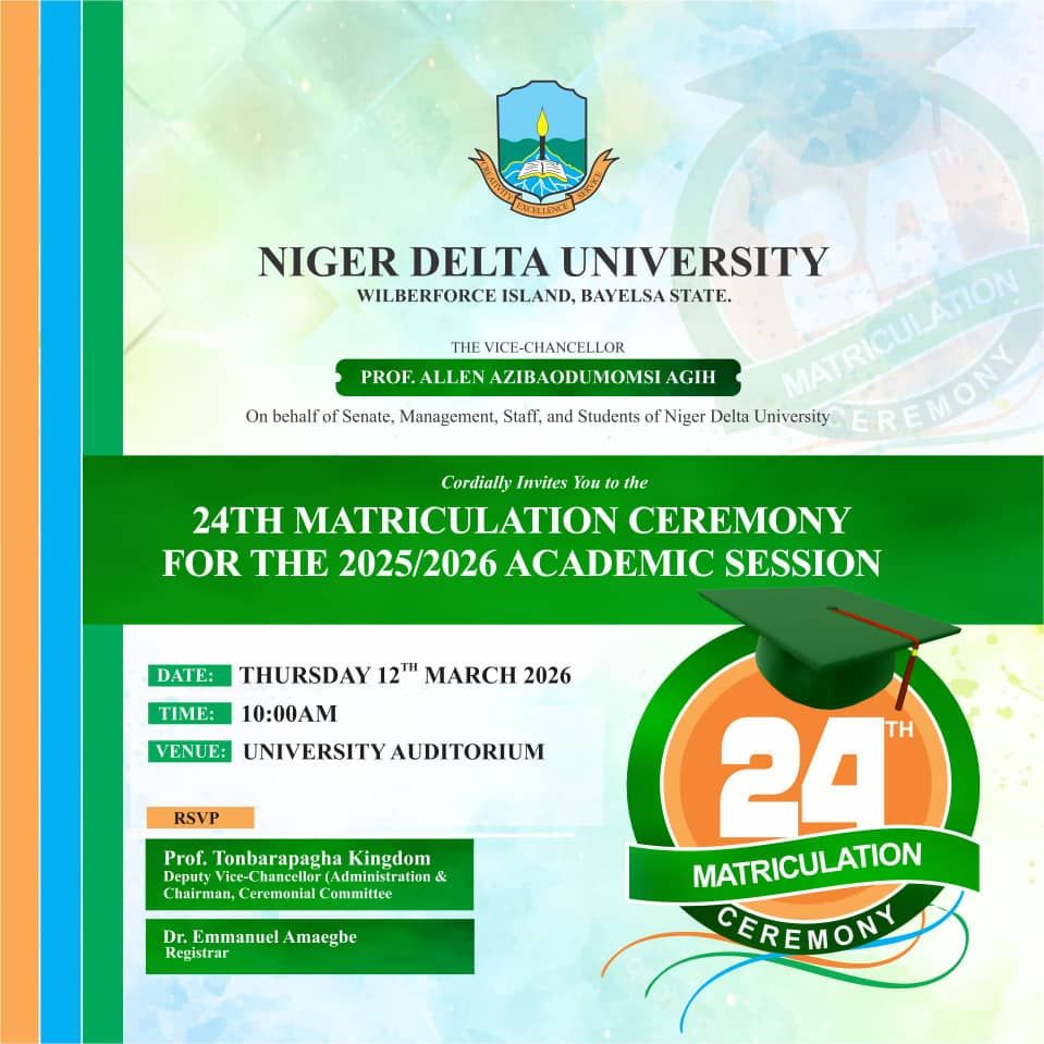 Niger Delta University presents The 24th Matriculation Ceremony for the 2025/2026 Academic Session.